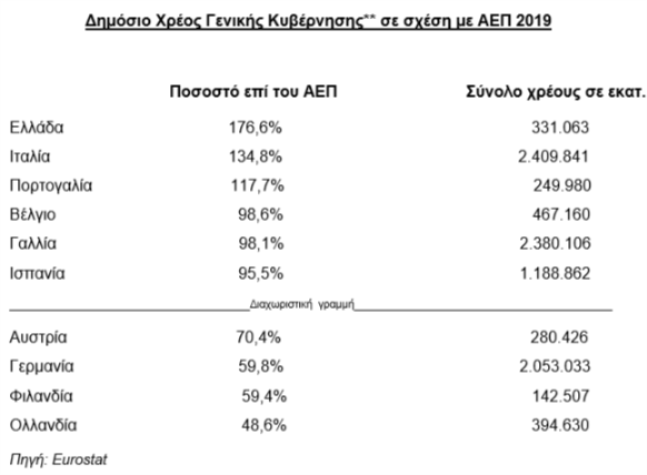 **Το χρέος της Γενικής Κυβέρνησης διαφέρει από το χρέος της Κεντρικής Διοίκησης κατά το ποσό του ενδοκυβερνητικού χρέους. Το ελληνικό χρέος της Κεντρικής Διοίκησης (356.015 εκατ.) είναι υψηλότερο από αυτό της Γενικής Κυβέρνησης.