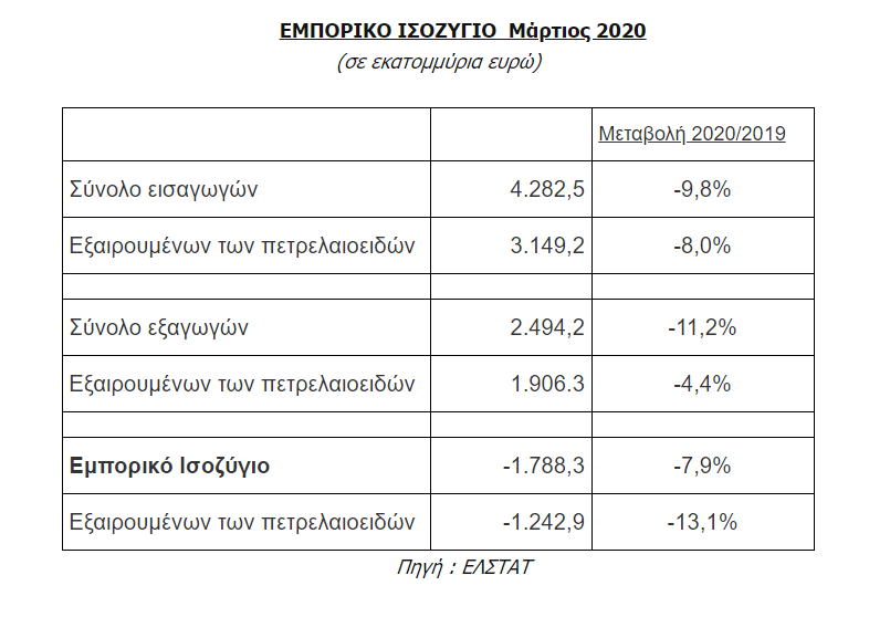 Σύμφωνα λοιπόν με την ΕΛΣΤΑΤ το Μάρτιο του 2020, σε σχέση με τον ίδιο μήνα του 2019, οι εισαγωγές αγαθών (εξαιρουμένων των πετρελαιοειδών) κατέγραψαν μείωση 8%. Συμπεριλαμβανομένων των πετρελαιοειδών η μείωση έφτασε το 9,8% (βλέπε πίνακα).