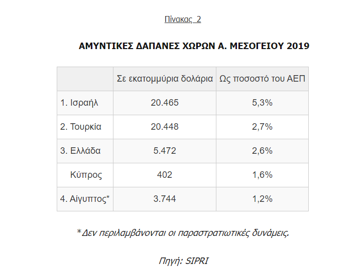 Η κυβέρνηση της Δαμασκού για να επιβιώσει, σ’ ένα τμήμα των εδαφών της, πέρασε στη σφαίρα επιρροής της Ρωσίας και δευτερευόντως του Ιράν. Η Ελλάδα χρεοκόπησε λόγω του ευρω-χρέους το 2010, αποδυναμώθηκε οικονομικά και ουσιαστικά υποδουλώθηκε στους δανειστές της (Βερολίνο), κάτι ανάλογο έγινε και στην Κύπρο. Το Ισραήλ παραμένει μια σταθερή δύναμη αλλά αισθάνεται στα βορειοανατολικά σύνορά του την απειλή του Ιράν και των οργανώσεων που αυτό ελέγχει στη Συρία και στο Λίβανο. Οι συσχετισμοί αμυντικών δαπανών στην Ανατολική Μεσόγειο παρουσιάζονται στον Πίνακα 2.