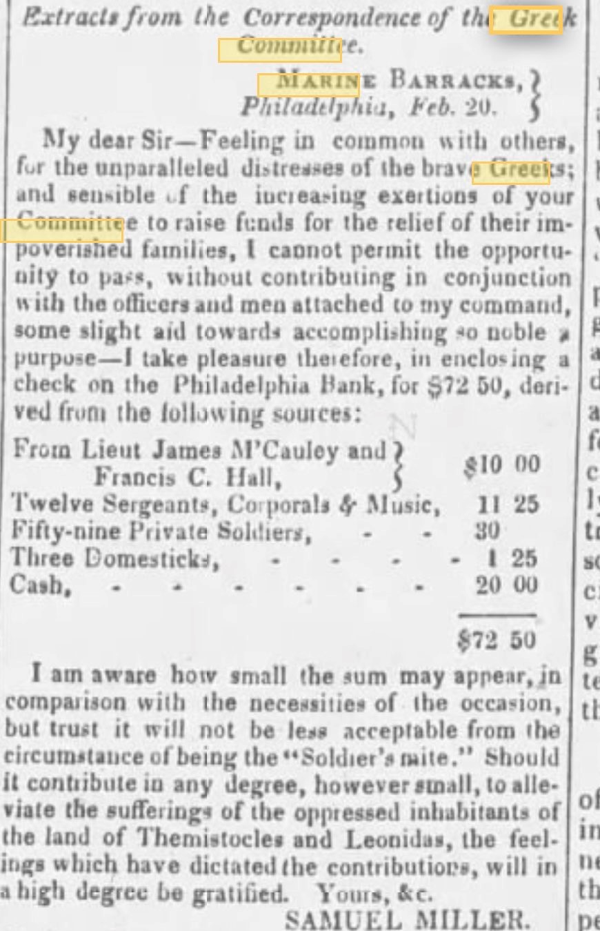 Αγαπητέ κύριε, αισθάνομαι από κοινού μαζί με άλλους για τις ασυναγώνιστες διακρίσεις των γενναίων Ελλήνων που είναι λογικοί και για τις αυξανόμενες προσπάθειες της επιτροπής σας για να συγκεντρώσει χρήματα για την ανακούφιση των άπορων οικογενειών, δεν μπορώ να επιτρέψω να περάσει η ευκαιρία χωρίς να συνεισφέρω μαζί με τους αξιωματικούς και τους υπόλοιπους άνδρες που βρίσκονται υπό τις διαταγές μου, κάποια μικρή βοήθεια για την επίτευξη των τόσο ευγενών σκοπών σας, γι ‘αυτό νιώθω ευλογημένος με το να εσωκλείω μια επιταγή στην τράπεζα της Φιλαδέλφειας από τις ακόλουθες πηγές: Yπολοχαγός James M’ Cauley and Francis C. Hall $10, Δώδεκα Λοχίες, Δεκανείς και Μουσικοί 11.25$, Πενήντα εννιά στρατιώτες 30$, Τρεις Οικείοι 1.25$, Μετρητά 20$ Τελικό ποσό 72.50$. Γνωρίζω πόσο μικρό μπορεί να φαίνεται το ποσό σε σύγκριση με τις ανάγκες της περίστασης, αλλά πιστεύω ότι θα είναι λιγότερο αποδεκτό από την περίσταση ότι το περίσσευμα του στρατιώτη θα πρέπει να συμβάλει σε οποιοδήποτε βαθμό όσο μικρό κι αν είναι, και να μετριάσει τα δεινά των καταπιεσμένων της γης του Θεμιστοκλή και του Λεωνίδα, έτσι τα συναισθήματα που έχουν υπαγορεύσει τις συνεισφορές σε μεγάλο βαθμό θα ικανοποιηθούν». SAMUEL MILLER