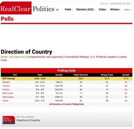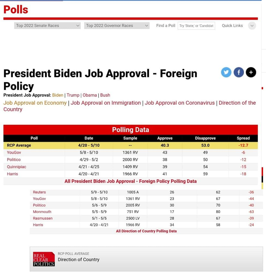 Εκτός από το χαμηλότατο 42%, η εικόνα του Biden υποφέρει και από άλλους δύο δείκτες: έναν πιο γενικό που αφορά την «κατεύθυνση της χώρας», [67,3% λάθος vs 26,3% σωστή, και -41% αρνητική διαφορά] και έναν πιο ειδικό για την εξωτερική πολιτική [53% αποδοκιμάζουν vs 40,3% επιδοκιμάζουν και -12,7> αρνητική διαφορά].