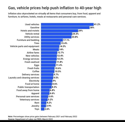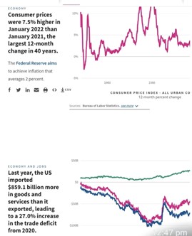 Ο πληθωρισμός έπιασε ταβάνι στο υψηλό 20ετίας με 7,5%, κάτι που αποτελεί σε ετήσια βάση διάρκεια ρεκόρ 40ετίας! Οι τιμές στα μεταχειρισμένα αυτοκίνητα αυξήθηκαν κατά 45%, στην βενζίνη 30%, στις ενοικιάσεις αυτοκινήτων 24,3%, ακόμη και στα ελαστικά και τα ανταλλακτικά 15,4 και 14,3 αντίστοιχα. Και όλοι ξέρουμε τι σημαίνει για τους Αμερικανούς το αυτοκίνητό τους. Είναι πιο σημαντικό και από το σπίτι τους!