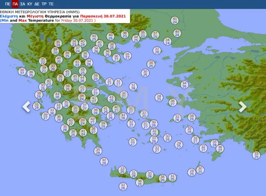 Θερμοκρασία: Από 25 έως 40 με 41 και κατά τόπους έως 42 βαθμούς Κελσίου.