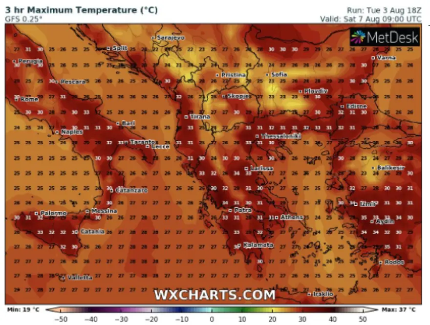 Θερμοκρασία: Από 27 έως 38 και στην Κρήτη τοπικά έως 41 βαθμούς Κελσίου.