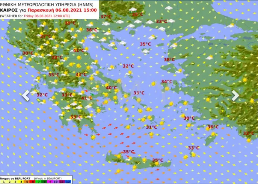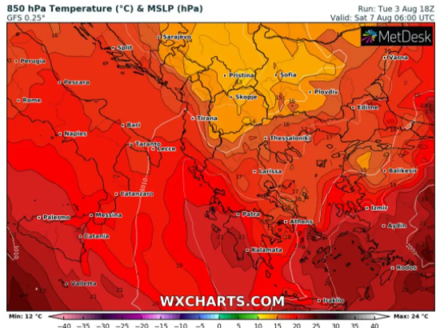 Θερμοκρασία: Στα νησιά από 26 έως 40 με 41 βαθμούς Κελσίου. Στα ηπειρωτικά από 22 έως 42 και κατά τόπους στη δυτική Στερεά και τη δυτική Πελοπόννησο έως 44 βαθμούς Κελσίου.