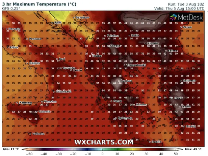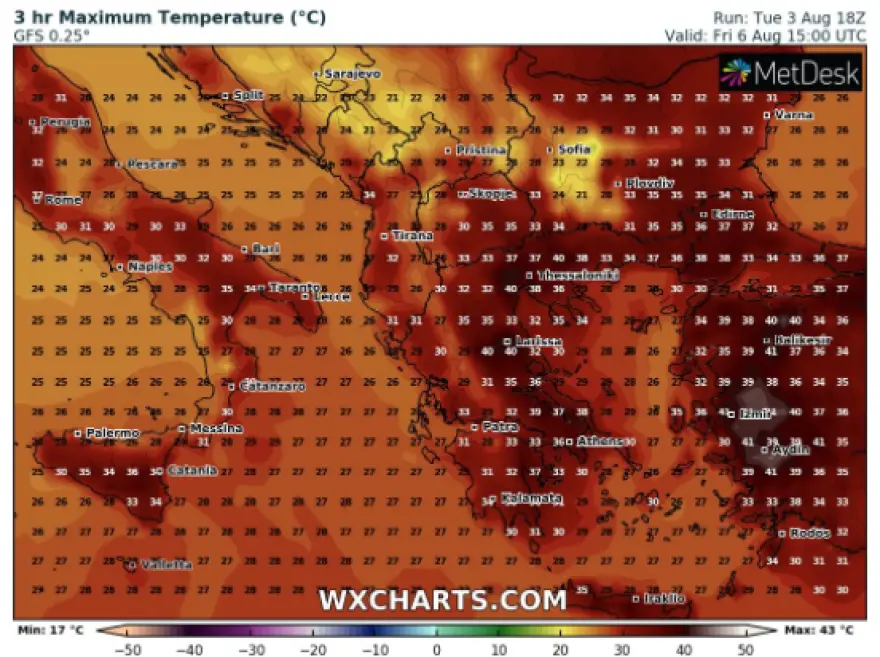 Θερμοκρασία: Από 25 έως 43 και κατά τόπους 44 με 45 βαθμούς Κελσίου.