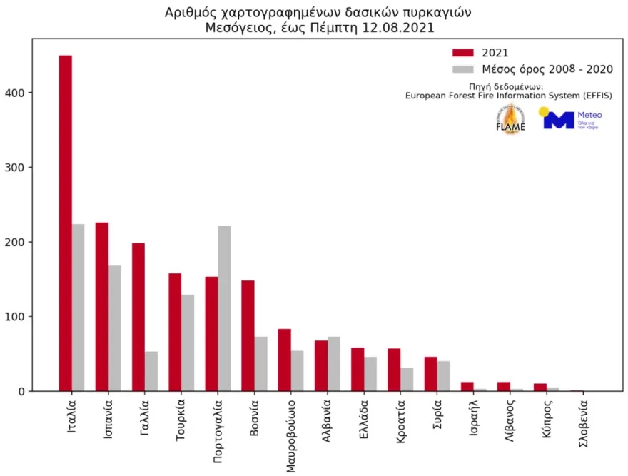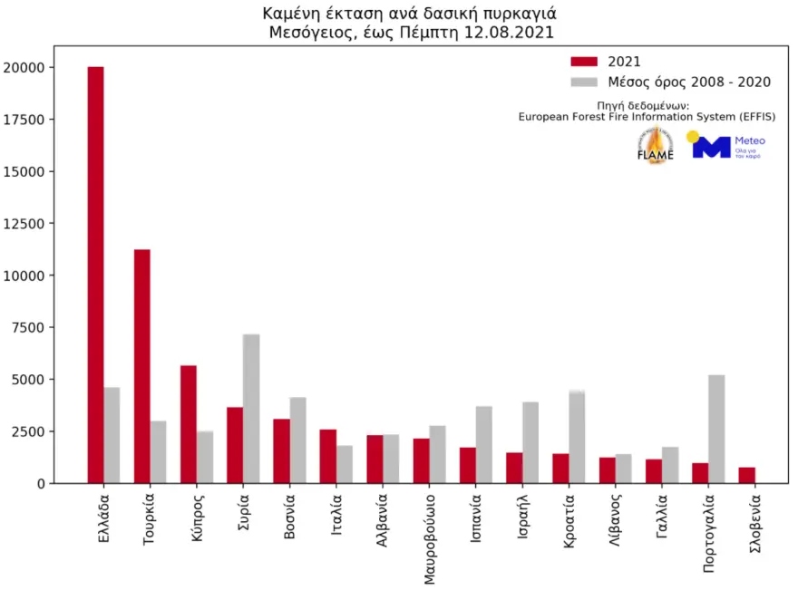 Σε απόλυτους αριθμούς, μέχρι και το βράδυ της Πέμπτης 12 Αυγούστου 2021, έχουν καταγραφεί στη χώρα μας 58 μεγάλες δασικές πυρκαγιές (Εικόνα 1), οι οποίες έκαψαν συνολική έκταση ίση με 1.161.650 στρέμματα (Εικόνα 2). Χρησιμοποιώντας τα δεδομένα αυτά, προκύπτει ότι η μέση καμένη έκταση ανά δασική πυρκαγιά στην Ελλάδα ανέρχεται σε περίπου 20.000 στρέμματα για το 2021 (έως και 13.08.2021), γεγονός που κατατάσσει τη χώρα μας πρώτη στη Μεσόγειο, με πολύ σημαντική διαφορά ακόμα και από τη δεύτερη Τουρκία (Εικόνα 3).