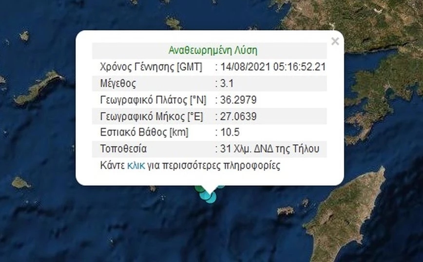 Σεισμός 3,1 Ρίχτερ σημειώθηκε τις πρώτες πρωινές ώρες στην Τήλο και πιο συγκεκριμένα 31 χλμ δυτικά-νοτιοδυτικά του νησιού.