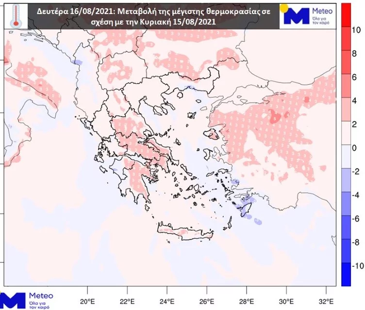 Ιδιαίτερα για σήμερα, Δευτέρα 16/08, θα σημειωθεί άνοδος της τάξης των 2 έως 3 βαθμών Κελσίου σε μεγάλο μέρος των ηπειρωτικών και της Κρήτης. Στον χάρτη που ακολουθεί, με κόκκινες αποχρώσεις σημειώνονται οι περιοχές όπου αναμένεται άνοδος της θερμοκρασίας. Στην Αθήνα το θερμόμετρο το μεσημέρι θα φτάσει κατά τόπους τους 32-34 βαθμούς, στη Θεσσαλονίκη τους 31-33 βαθμούς, στην Πάτρα τους 35-37 βαθμούς, στη Λάρισα τους 36-38 βαθμούς και στο Ηράκλειο τους 28-30 βαθμούς Κελσίου.