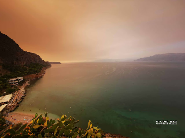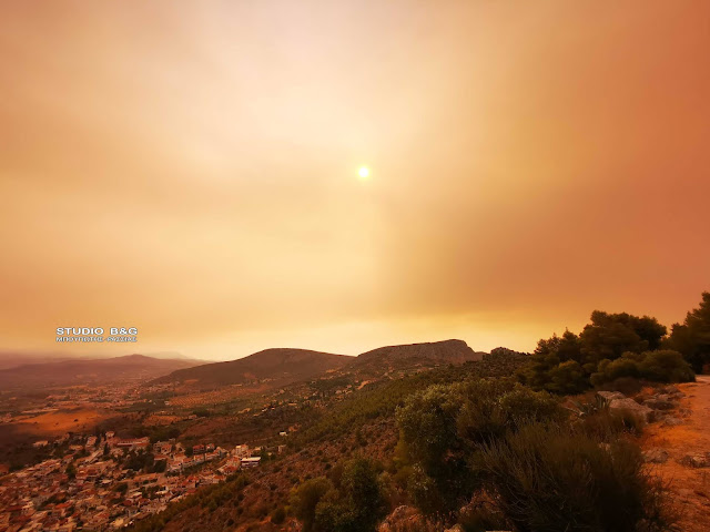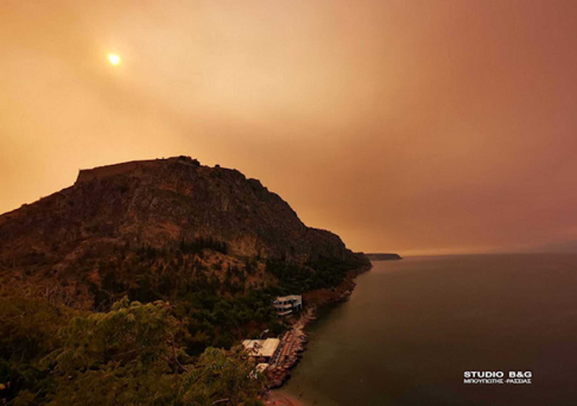 Όπως αναφέρει το τοπικό μέσο, το φαινόμενο είναι ιδιαίτερα έντονο στο Ναύπλιο με τον ουρανό να έχει κοκκινίσει, ενώ ακόμα και ο ήλιος έχει κρυφτεί πίσω από το νέφος καπνού.