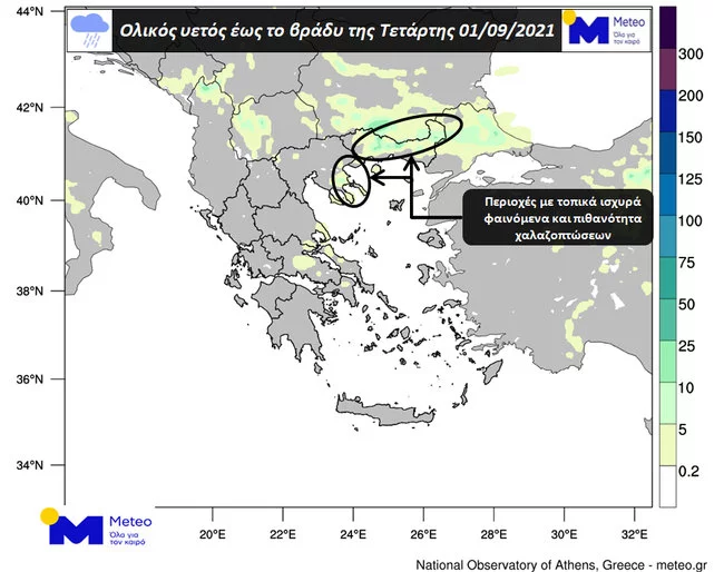 Στον χάρτη του meteo που ακολουθεί παρουσιάζεται ο ολικός υετός που αναμένεται έως το βράδυ της Τετάρτης 01/09 καθώς και οι περιοχές όπου τα φαινόμενα θα είναι ισχυρότερα και υπάρχει πιθανότητα χαλαζοπτώσεων.