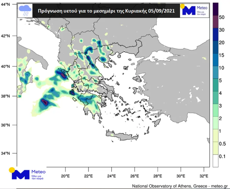 -Ισχυρές βροχές και καταιγίδες, θα εκδηλωθούν από τις πρωινές ώρες της Κυριακής (05-09-2021) στα νησιά του Ιονίου και προς το μεσημέρι στην Ήπειρο, τη δυτική και κεντρική Στερεά, τη δυτική και βαθμιαία την ανατολική Πελοπόννησο, τη δυτική και κεντρική Μακεδονία και τη Θεσσαλία.