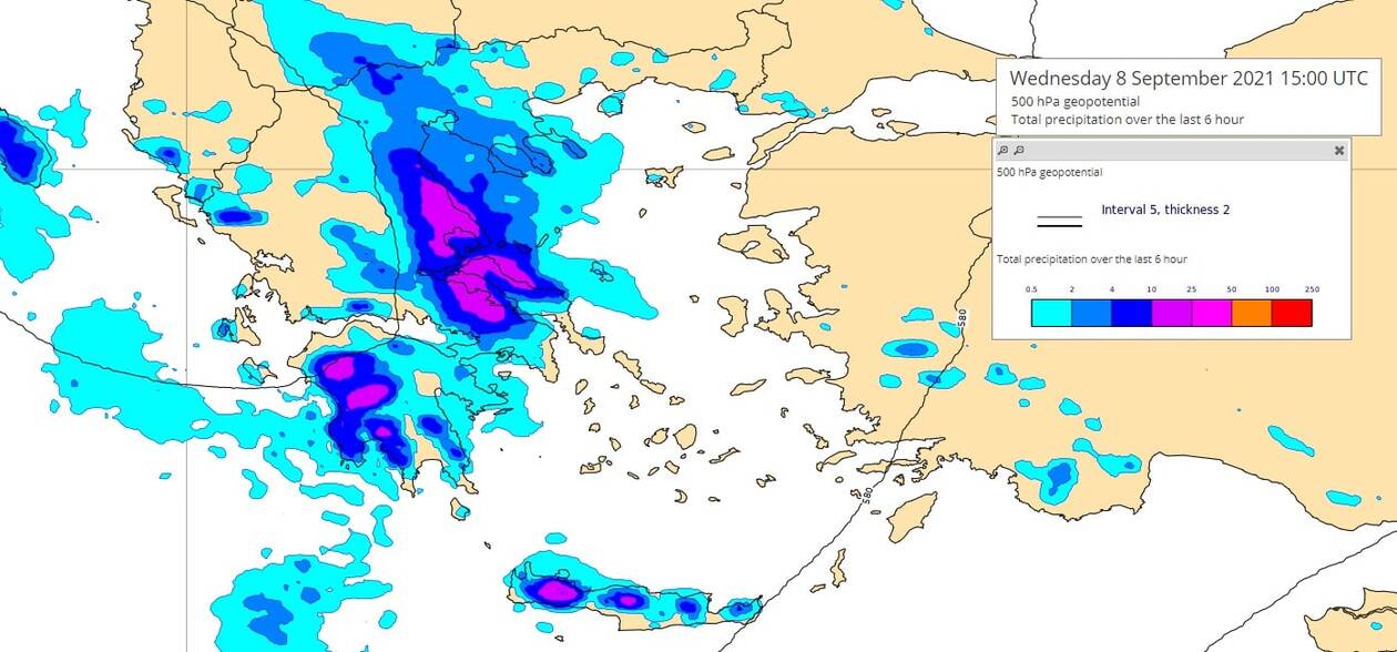 Τοπικά ισχυρές βροχές προβλέπονται στις Σποράδες, την Εύβοια (κυρίως τη βόρεια), τη Θεσσαλία, την ανατολική Στερεά, τα δυτικά τμήματα της Κρήτης και πιθανώς στην κεντρική Μακεδονία, ενώ στη δυτική Πελοπόννησο θα εκδηλωθούν και καταιγίδες που πρόσκαιρα θα είναι έντονες.