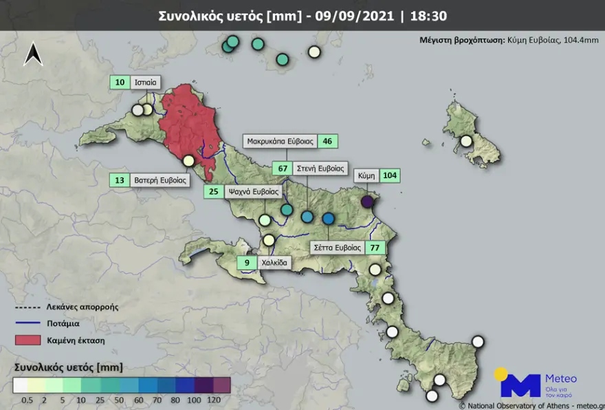 Στο χάρτη που ακολουθεί με κόκκινο αποτυπώνεται η καμένη έκταση από τις μεγάλες πυρκαγιές του Αυγούστου, ενώ επισημαίνονται οι θέσεις των μετεωρολογικών σταθμών και τα ύψη βροχόπτωσης που έχουν καταγράψει.