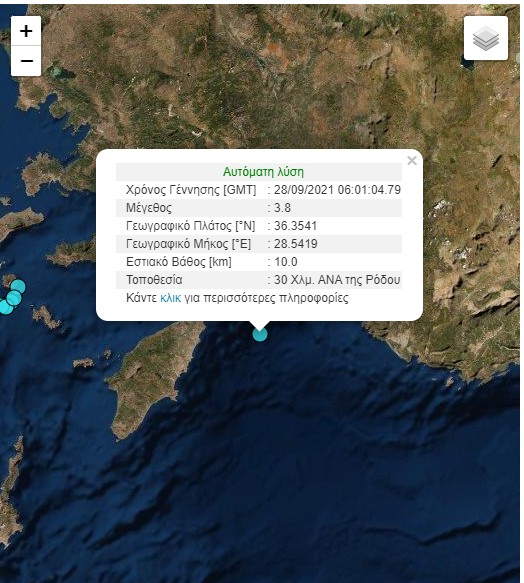 Σεισμική δόνηση μεγέθους 3,8 βαθμών της κλίμακας Ρίχτερ σημειώθηκε λίγο μετά της 9 το πρωί (09:01) της Τρίτης ανοιχτά της Ρόδου.