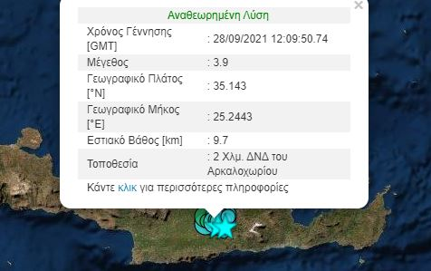 Σύμφωνα με την αναθεωρημένη λύση του Γεωδυναμικού Ινστιτούτου του Αστεροσκοπείου Αθηνών, στις 15.09 το μεσημέρι της Τρίτης (28/9) σημειώθηκε σεισμική δόνηση μεγέθους 3,9 βαθμών της κλίμακας Ρίχτερ στο Ηράκλειο.