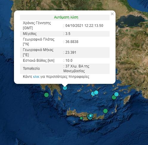 Σεισμική δόνηση μεγέθους 3,5 βαθμών της κλίμακας Ρίχτερ σημειώθηκε το μεσημέρι της Δευτέρας 4 Οκτωβρίου στη Μονεμβασιά.