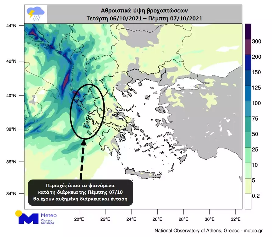 Σύμφωνα με τα προγνωστικά στοιχεία του Εθνικού Αστεροσκοπείου Αθηνών/meteo.gr, βροχές και καταιγίδες θα εκδηλωθούν από σήμερα, Τετάρτη 6 Οκτωβρίου, το απόγευμα στο Ιόνιο.