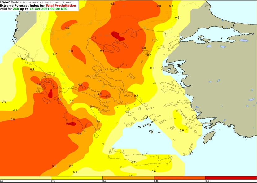 Στους χάρτες παρουσιάζονται τα ύψη βροχόπτωσης 24ωρου στον πρώτο χάρτη και στον δεύτερο υπάρχει η χρωματική απεικόνιση του δείκτη Extreme Forecast Index όπου αποτυπώνεται πολύ καθαρά η δυναμική του συστήματος κακοκαιρίας