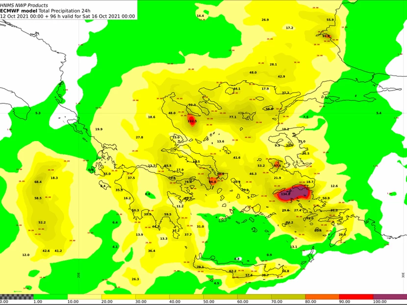 Στους χάρτες παρουσιάζονται τα ύψη βροχόπτωσης 24ωρου στον πρώτο χάρτη και στον δεύτερο υπάρχει η χρωματική απεικόνιση του δείκτη Extreme Forecast Index όπου αποτυπώνεται πολύ καθαρά η δυναμική του συστήματος κακοκαιρίας