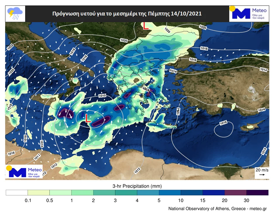 Στους χάρτες που ακολουθούν παρουσιάζεται ενδεικτικά ο υετός που αναμένεται το μεσημέρι (Εικόνα 1) και τις πρώτες βραδινές ώρες (Εικόνα 2) της Πέμπτης 14/10.