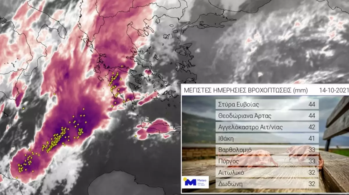 Το δίκτυο των αυτόματων μετεωρολογικών σταθμών του Εθνικού Αστεροσκοπείου Αθηνών/meteo.gr κατέγραψε τα μεγαλύτερα ύψη βροχής και καταιγίδας από την αρχή του εικοσιτετραώρου έως σήμερα το πρωί, Πέμπτη 14 Οκτωβρίου, στα Στύρα Ευβοίας (44 χιλιοστά), στα Θεοδώριανα Άρτας (44), στο Αγγελόκαστρο Αιτωλοακαρνανίας (42) και στην Ιθάκη (41).