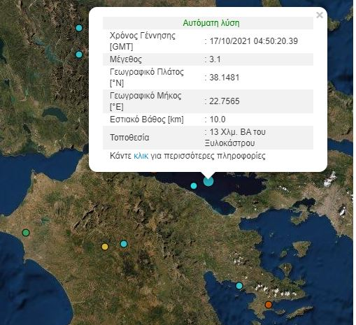 Σεισμική δόνηση μεγέθους 3,1 βαθμών της κλίμακας Ρίχτερ σημειώθηκε στις 07:50 το πρωί της Κυριακής κοντά στο Ξυλόκαστρο.