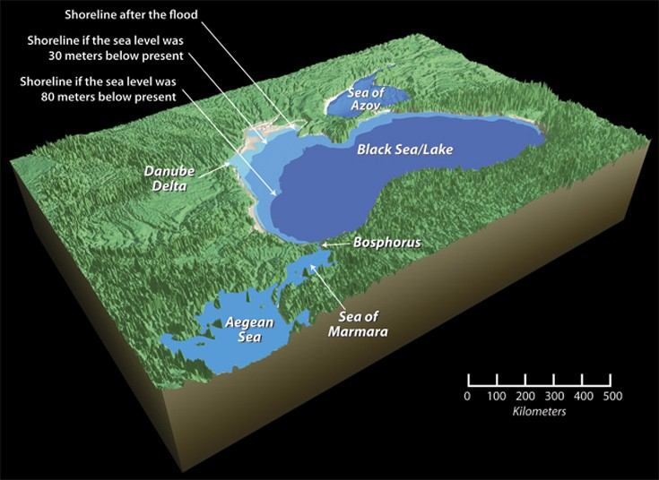 Η μεγαλύτερη πλημμύρα έλαβε ωστόσο χώρα στη Μαύρη Θάλασσα, που εκείνη την εποχή δεν ήταν παρά μια σχετικά μικρή λίμνη. Η άνοδος της στάθμης των νερών έκανε τον Βόσπορο να υποχωρήσει και το νερό της Μεσογείου όρμησε μέσα στη λίμνη, γεννώντας στην πορεία την τεράστια Μαύρη Θάλασσα. Η Μαύρη Θάλασσα γέμιζε νερό για τους επόμενους τρεις αιώνες, καταπίνοντας ολοένα και περισσότερη στεριά εντός της, αν και δεν υπάρχει επιστημονική συναίνεση ούτε για την ποσότητα των υδάτων ούτε για την ταχύτητα με την οποία έλαβε χώρα ο κατακλυσμός…