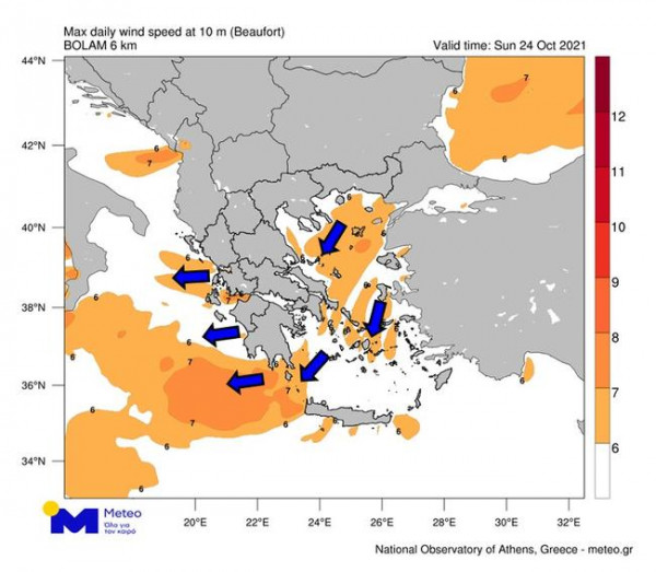 Παράλληλα, άνεμοι βορείων διευθύνσεων με εντάσεις έως 7 μποφόρ θα επικρατήσουν στο Αιγαίο, ενώ το ανατολικό ρεύμα στο Ιόνιο θα παρουσιάσει σταδιακά σημαντική ενίσχυση, φτάνοντας στα επίπεδα των 6-7 μποφόρ. Στον προγνωστικό χάρτη που ακολουθεί παρουσιάζονται οι επικρατούσες διευθύνσεις και οι εκτιμώμενες μέγιστες εντάσεις των ανέμων κατά τη διάρκεια της Κυριακής.
