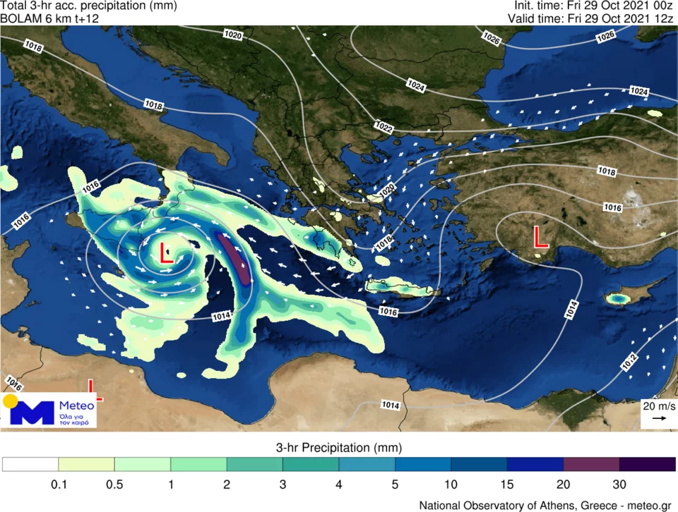 Ο μεσογειακός κυκλώνας Νέαρχος που σχηματίστηκε στις 28 Οκτωβρίου στην Κεντρική Μεσόγειο, βρίσκεται σήμερα 90 χιλιόμετρα νοτιοανατολικά της Σικελίας.