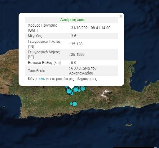 Σεισμική δόνηση μεγέθους 3,6 βαθμών της κλίμακας Ρίχτερ σημειώθηκε στις 10:41 το πρωί της Κυριακής (31/10) στην Κρήτη.