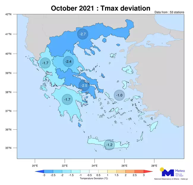 Οι τιμές των αποκλίσεων για τη Μακεδονία, τη Θράκη, τη Δυτική Ελλάδα, τα Επτάνησα, τη Θεσσαλία, τη Στερεά και την Κρήτη ήταν ελαφρώς πάνω (περίπου 0,3 βαθμούς) από τις αντίστοιχες του Οκτωβρίου 2010, του ψυχρότερου Οκτωβρίου την τελευταία δεκαετία.
