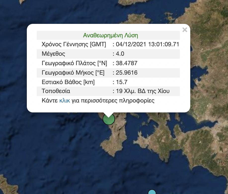Σεισμός 4 ρίχτερ σημειώθηκε πριν από λίγο στο νησί της Χίου.