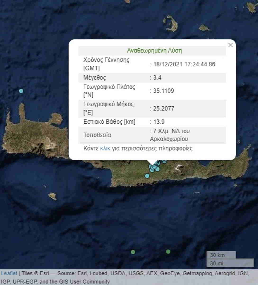 Σύμφωνα με το Γεωδυναμικό Ινστιτούτο του Εθνικού Αστεροσκοπείου Αθηνών, 24′ λεπτά μετά τις 7 το απόγευμα του Σαββάτου, σημειώθηκε σεισμός 3,4 βαθμών της κλίμακας Ρίχτερ, στο Αρκαλοχώρι Ηρακλείου Κρήτης.