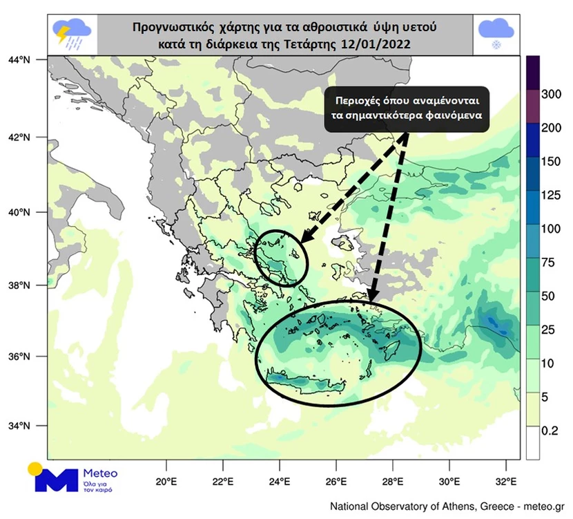 Οι βροχοπτώσεις που εκδηλώνονται κατά τόπους και οι χιονοπτώσεις που σημειώνονται ακόμα και σε περιοχές χαμηλού υψομέτρου μέχρι το τέλος της ημέρας θα περιοριστούν στα νοτιότερα τμήματα της χώρας. Οι περιοχές που θα δεχτούν τα σημαντικότερα φαινόμενα είναι οι Κυκλάδες, η Κρήτη, τα Δωδεκάνησα και η Εύβοια.