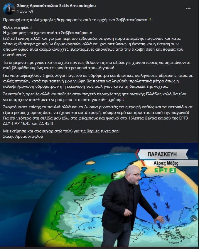 Ο Σάκης Αρναούτογλου τονίζει πως η ένταση του παγετού θα είναι τέτοια, που μπορεί να προκληθούν και ζημιές, για αυτό και αναφέρει τρόπους που θα μπορούσαν να αποφευχθούν ενώ, μέχρι στιγμής, προβλέπονται αξιόλογες χιονοπτώσεις στα νησιά του Αιγαίου. Υπενθυμίζεται πως και ο μετεωρολόγος, Γιάννης Καλιάνος, ανέφερε ότι θα γίνει ψυχρή εισβολή σε δύο κύματα.