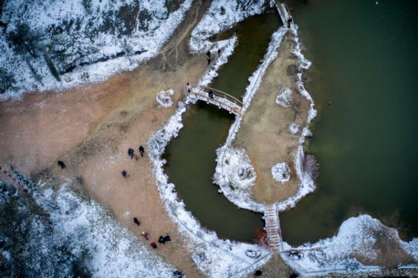 Στη λίμνη Μπελέτσι ένα λευκό πέπλο κάλυψε τον περιβάλλοντα χώρο, ενώ παρά τις χαμηλές θερμοκρασίες οι επισκέπτες δεν σταμάτησαν να απαθανατίζουν το τοπίο.
