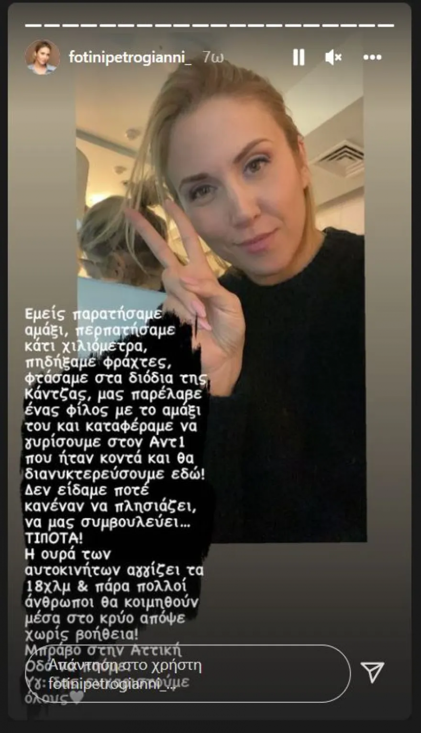 Ανάμεσα σε εκείνους που βρέθηκαν εγκλωβισμένοι στην Αττική Οδό για 11 ώρες είναι και η Φωτεινή Πετρογιάννη.