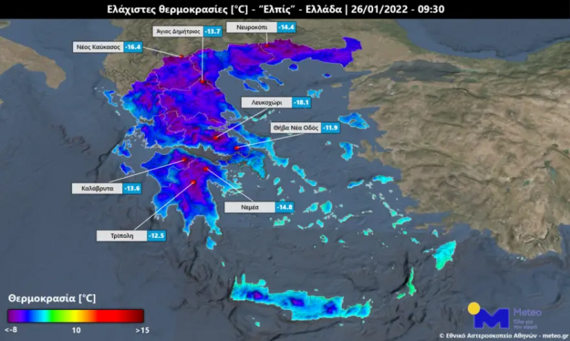 Στον παρακάτω χάρτη, με χρωματική κλίμακα παρουσιάζονται οι ελάχιστες θερμοκρασίες τις πρώτες πρωινές ώρες της Τετάρτης 26/01/2022, όπως κατεγράφησαν από το δίκτυο αυτόματων μετεωρολογικών σταθμών του Εθνικού Αστεροσκοπείου Αθηνών / Meteo.gr, καθώς και οι τιμές από οκτώ επιλεγμένες περιοχές.