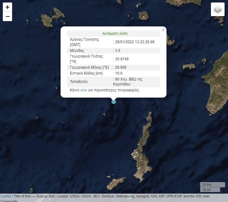Σεισμός σημειώθηκε στις 3:22 ο μεσημέρι της Παρασκευής (28.01.2022) βόρεια και δυτικά της Καρπάθου. Το αρχικό μέγεθος είναι 3,5 βαθμοί της κλίμακας Ρίχτερ, σύμφωνα με την αυτόματη λύση του Γεωδυναμικού Ινστιτούτου του Εθνικού Αστεροσκοπείου Αθηνών.