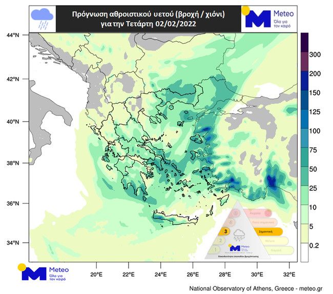 Σύμφωνα με τα τελευταία προγνωστικά δεδομένα του meteo.gr, συνεχίζεται σήμερα η κακοκαιρία, η οποία έχει Δείκτη Επικινδυνότητας Επεισοδίου Βροχόπτωσης 3 (με μέγιστο δείκτη το 5).