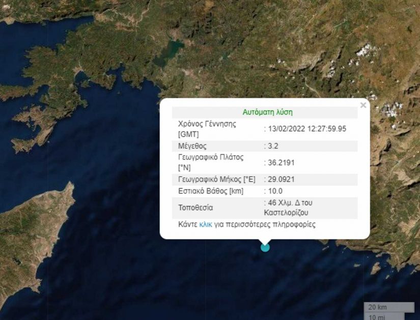 Σύμφωνα με το Γεωδυναμικό Ινστιτούτο του Εθνικού Αστεροσκοπείου Αθηνών, το μεσημέρι της Κυριακής, σημειώθηκε σεισμός μεγέθους 3,2 βαθμών της κλίμακας Ρίχτερ κοντά στο Καστελόριζο.
