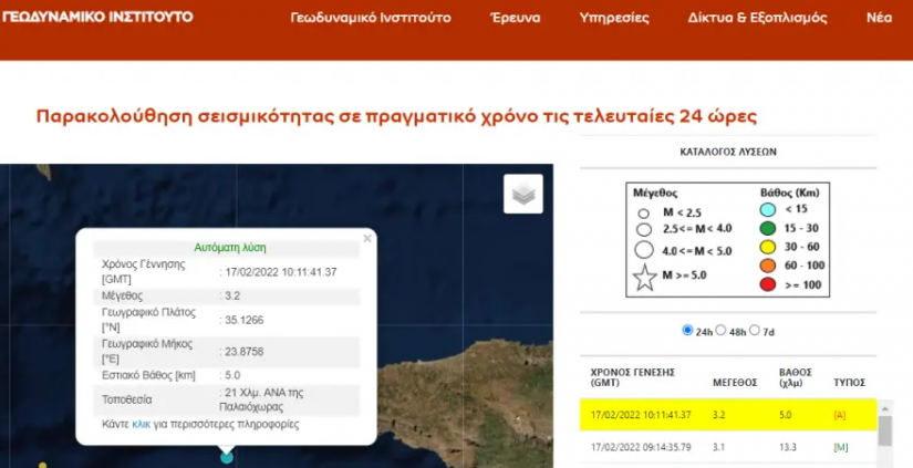 Σεισμός μεγέθους 3,2 βαθμών της κλίμακας Ρίχτερ σημειώθηκε στις 12:11, στην Παλαιοχώρα Χανίων.