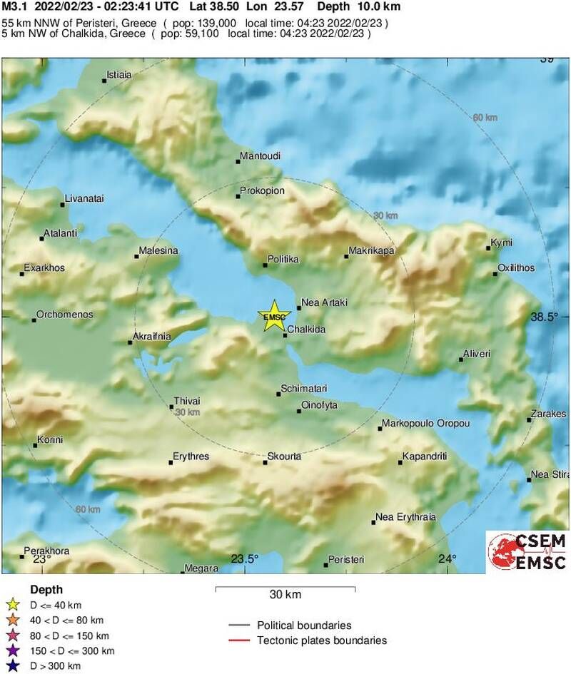 Σύμφωνα με την αυτόματη λύση του EMSC, τα ξημερώματα της Τετάρτης και συγκεκριμένα στις 04:23 και στις 02:25, σημειώθηκε διπλή ασθενής σεισμική δόνηση μεγέθους 3,1 και 3,0 βαθμών της κλίμακας Ρίχτερ, σε περιοχή κοντά στη Χαλκίδα.
