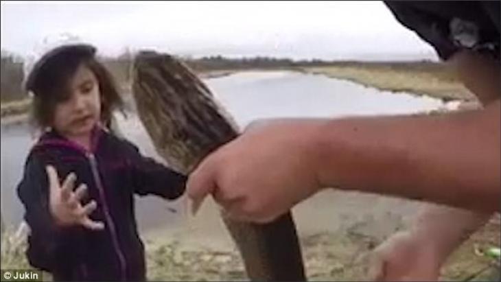 Το κορίτσι έμεινε άναυδο, όταν το ψάρι γλίστρησε και πήγε στο πρόσωπο της με αποτέλεσμα, να τρομάξει ενώ οι δικοί τραβούσαν το ατύχημα σε βίντεο.