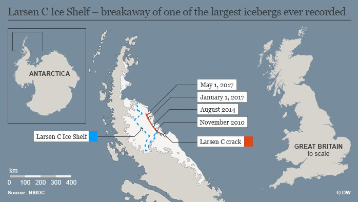 Τους τελευταίους μήνες, ένα τεράστιο κομμάτι πάγου, το Larsen C της Ανταρκτικής ήταν έτοιμο να αποκολληθεί ως αποτέλεσμα μίας μεγάλης ρωγμής. Με την αποστολή του Ευρωπαϊκού Κέντρου Διαστήματος (ESA) Copernicus Sentinel-1, ένα τεμάχιο πάγου πάνω από το διπλάσιο του Λουξεμβούργου και μεγαλύτερο από την Ουαλία, τελικά διασπάστηκε στις 12 Ιουλίου 2017.