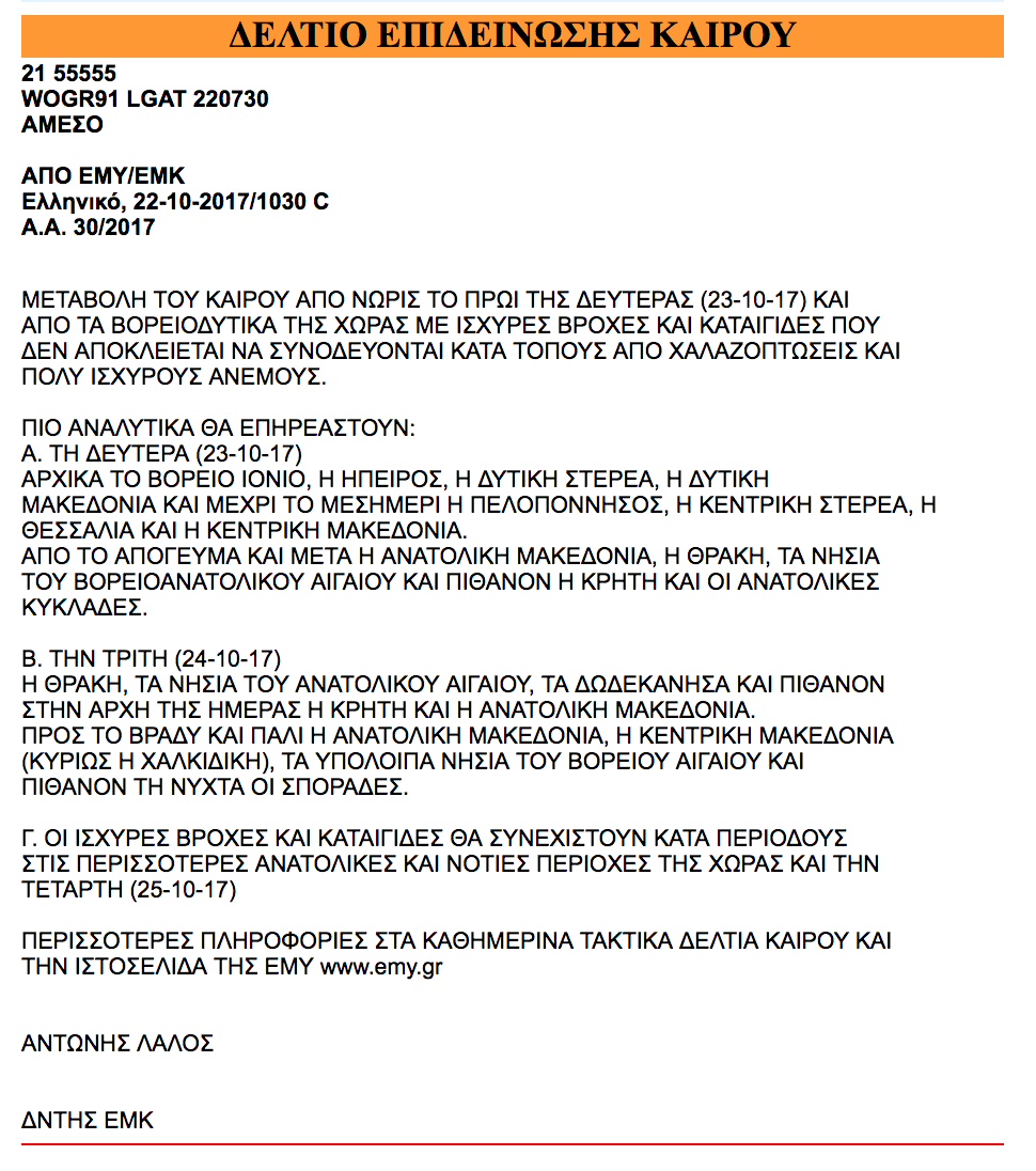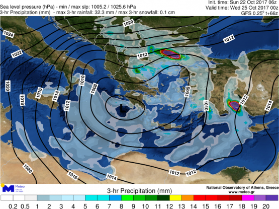 Τονίζεται ότι τις βραδινές ώρες ισχυρές καταιγίδες θα επηρεάσουν τα ανατολικά νησιωτικά τμήματα του Αιγαίου, τις Ανατολικές Κυκλάδες, την Κρήτη και ιδιαίτερα την Ανατολική Μακεδονία, τη Θράκη και τα νησιά του Βορειοανατολικού Αιγαίου. Παράλληλα θα εκδηλωθεί πρόσκαιρη έντονη μεταφορά Αφρικανικής σκόνης.