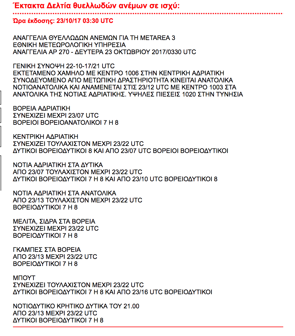 Οι άνεμοι στο Κεντρικό και Βόρειο Αιγαίο θα πνέουν από νότιες διευθύνσεις σχεδόν μέτριοι έως μέτριοι, 4 με 5 μποφόρ, ενισχυόμενοι σταδιακά σε ισχυρούς έως σχεδόν θυελλώδεις 6 με 7 μποφόρ, αλλά το βράδυ θα στραφούν σε δυτικούς με ίδιες εντάσεις. Στο Νότιο Αιγαίο θα νοτιοδυτικοί άνεμοι με ίδιες εντάσεις αρχικά έως 5 μποφόρ και σταδιακή ενίσχυση στα 6 με 7 μποφόρ. Στο Ιόνιο οι άνεμοι θα πνέουν από δυτικές διευθύνσεις μέτριοι μέχρι ισχυροί, 5 με 6 μποφόρ, αλλά σταδιακά θα στραφούν σε βορειοδυτικούς και θα ενισχυθούν σε ισχυρούς έως σχεδόν θυελλώδεις, 6 με 7 μποφόρ, και στα βόρεια πελάγη τοπικά θυελλώδεις 8 μποφόρ. Πολύ ενισχυμένο δυτικό ρεύμα αναμένεται να επικρατήσει στον Κορινθιακό κόλπο, με εντάσεις που θα αγγίξουν και τα 8 μποφόρ.