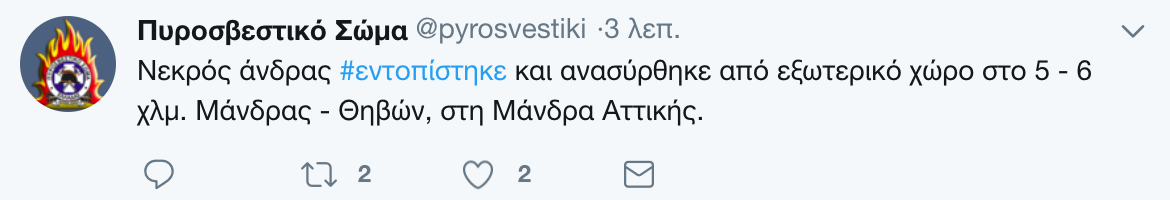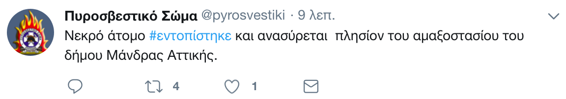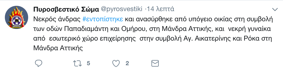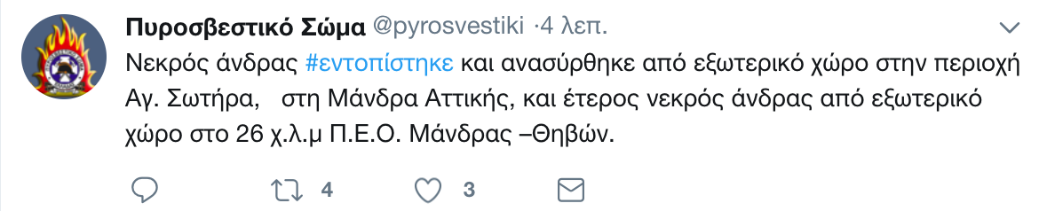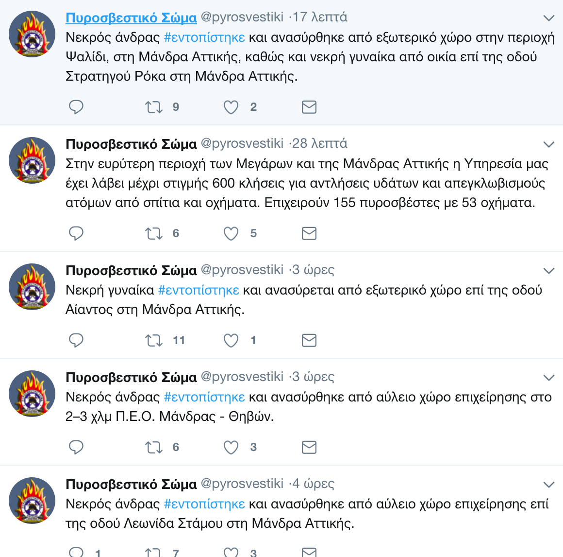 Μια ώρα πριν, στο «Θριάσιο» είχε μεταφερθεί νεκρός ένας ακόμη άνδρας, ενώ η πυροσβεστική ενημέρωνε για δυο ακόμη νεκρούς: «Νεκρός άνδρας #εντοπίστηκε και ανασύρθηκε από εξωτερικό χώρο στην περιοχή Ψαλίδι, στη Μάνδρα Αττικής, καθώς και νεκρή γυναίκα από οικία επί της οδού Στρατηγού Ρόκα στη Μάνδρα Αττικής».