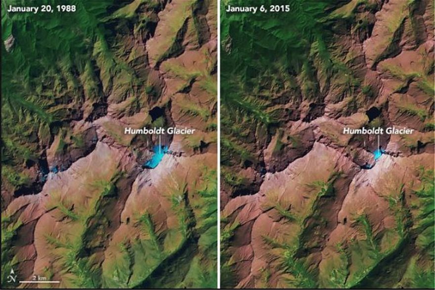 Ο δυροφόρος της NASA Landsat 8 κατέγραψε τα τελευταία χρόνια τις ραγδαίες εξελίξεις στον παγετώνα της Βενεζουέλας. Ο παγετώνας βρίσκεται μέσα στη Σιέρα Νεβάδα ντε Μερίδα – το υψηλότερο τμήμα των βουνών των Άνδεων στη Βενεζουέλα. Βρίσκεται σε μία περιοχή κάτω από την κορυφή Pico Humboldt, σε υψόμετρο 4.942 μέτρων.